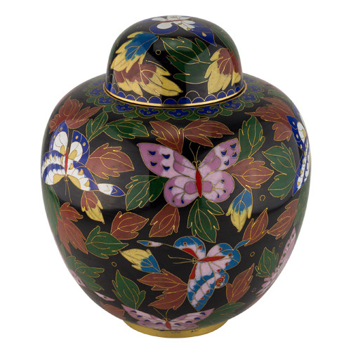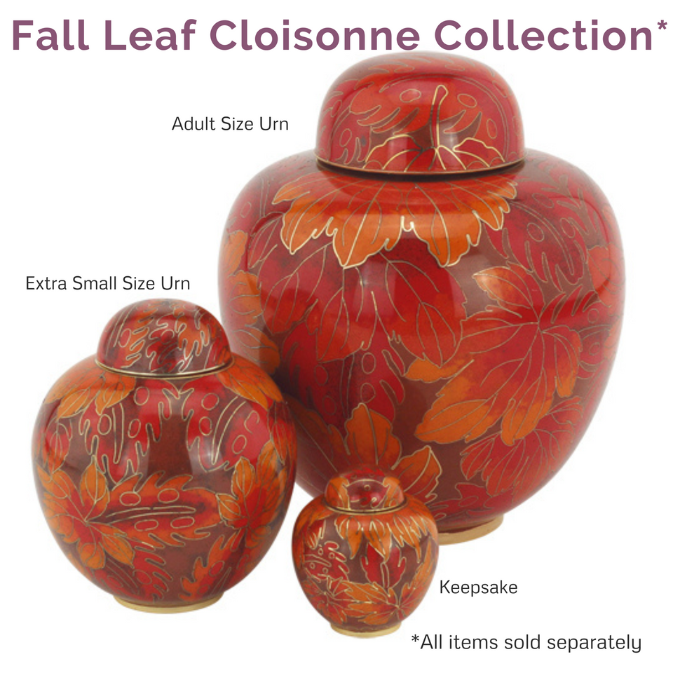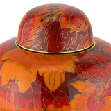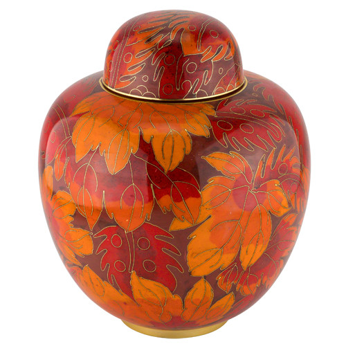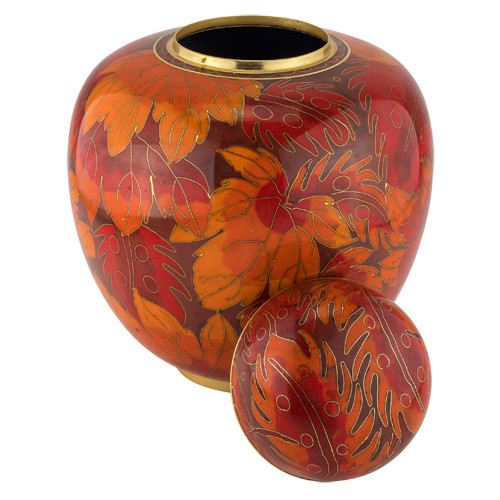 The Fall Leaf Cloisonne Urn for ashes in beautiful shades of oranges and red fall foliage. This adult size urn is made using cloisonne, an ancient art form invented by the French and perfected by the Chinese. Made from brass, copper and colored enamel, cloisonne is crafted by hand and the finished item is fired in a kiln and gilded. As a result of this meticulous process, every cloisonne piece is a beautiful, durable and unique work of art.