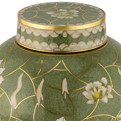 The Pear Blossom Cloisonne Cremation Urn is memorable for its beautiful shades of pear green and detailed cloisonne work of blooming flowers. This adult size urn is cloisonne, an ancient art still made by hand today. The finished item is gilded with gold such as details around flower petals and the edge of the lid. As a result of this meticulous process, every cloisonne urn for ashes is a beautiful, durable and unique work of art to pay tribute to your loved one.