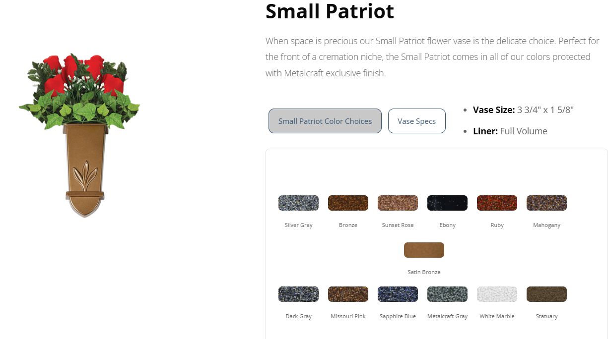 When space is precious our Small Patriot flower vase is the delicate choice. Perfect for the front of a cremation niche, the Small Patriot comes in all of our colors protected with Metalcraft exclusive finish.